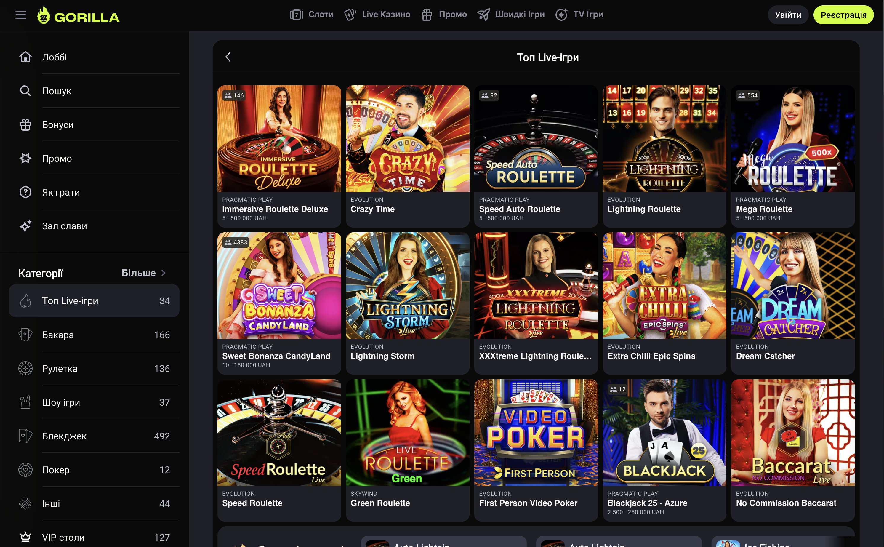 У Gorilla зазвичай доступні основні категорії: слоти, краш-ігри, карткові ігри, live-казино та TV-ігри. Для користувача важливі дві речі: зручна навігація (фільтри, пошук, категорії) і якість контенту (актуальні тайтли, різні провайдери, зрозумілий запуск з мобільного та десктопу).